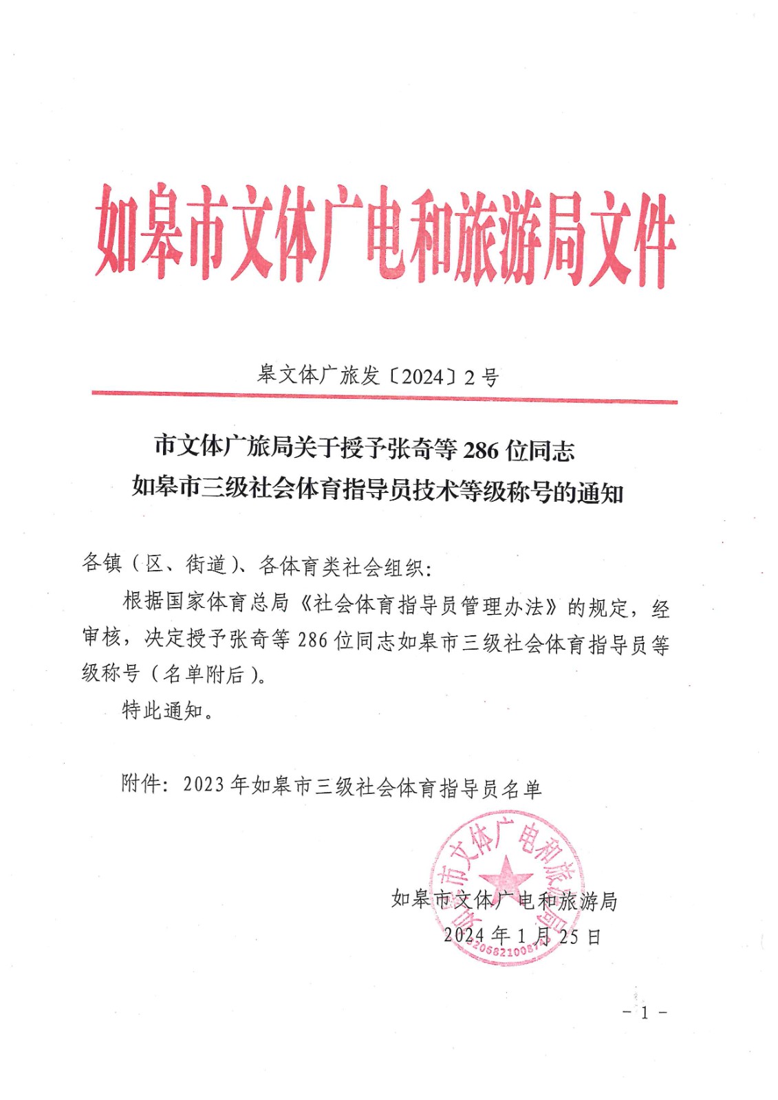 市文體廣旅局關(guān)于授予張奇等286位同志如皋市三級社會指導(dǎo)員技術(shù)等級稱號的通知